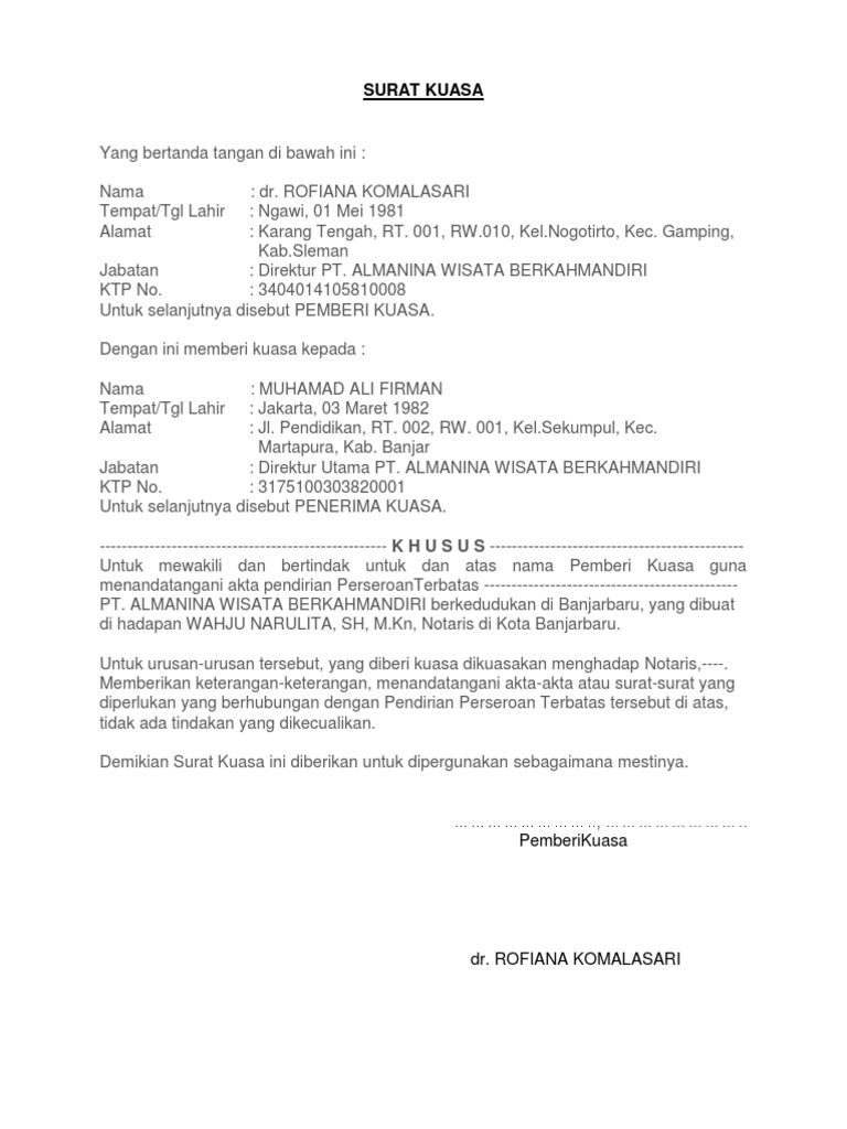 surat-kuasa from imgv2-2-f.scribdassets.com Surat ini biasanya berkenaan dengan kegiatan pelaksanaan penugasan kegiatan penting. Contoh surat kuasa in english mp3 & mp4. 321 selanjutnya disebut pemberi kuasa. In indonesia neither the drafter nor the receiver of the power of attorney needs to be a lawyer. Atas perhatian dang kerjasamanya saya ucapkan terima kasih. Surat kuasa in a sentence and translation of surat kuasa in english dictionary with audio pronunciation by dictionarist.com. Pada surat kuasa orang yang menerima kuasa ini mempunyai hak penuh sesuai apa yang dikuasakan. Savesave surat kuasa for later.